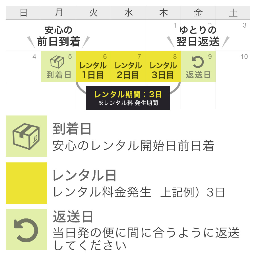 - カリナイトでは、商品到着日と返却の発送日はレンタル期間に含みません。